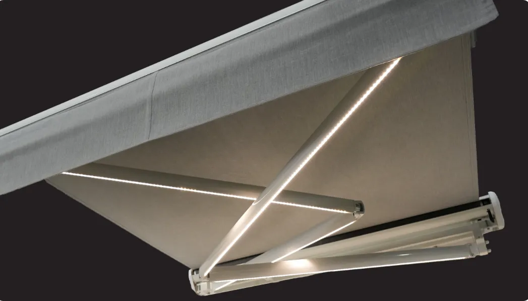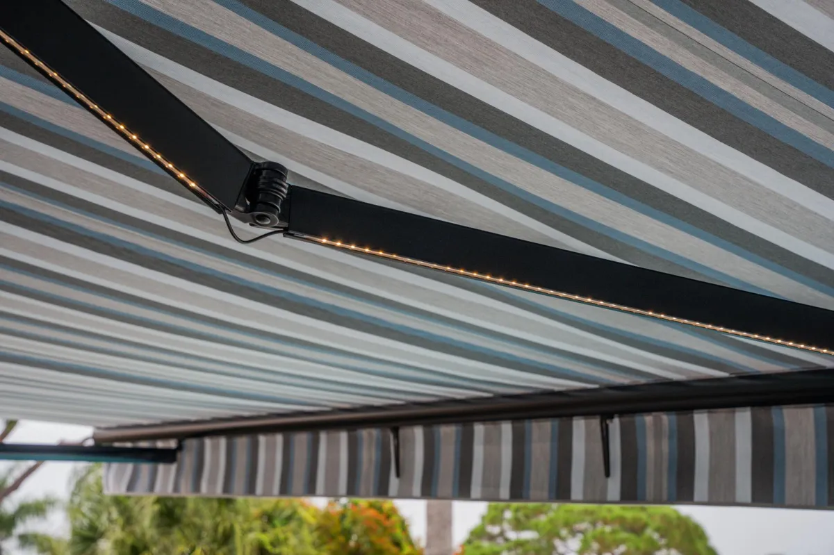 Radiance Class awnings come with an integrated cassette housing that protects the fabric from weather-related damage, significantly extending its lifespan. This premium feature, standard on all FL Outdoor awnings, acts like a "garage" when retracted, shielding the fabric from excessive fading, insect and bird damage, and other common wear issues.